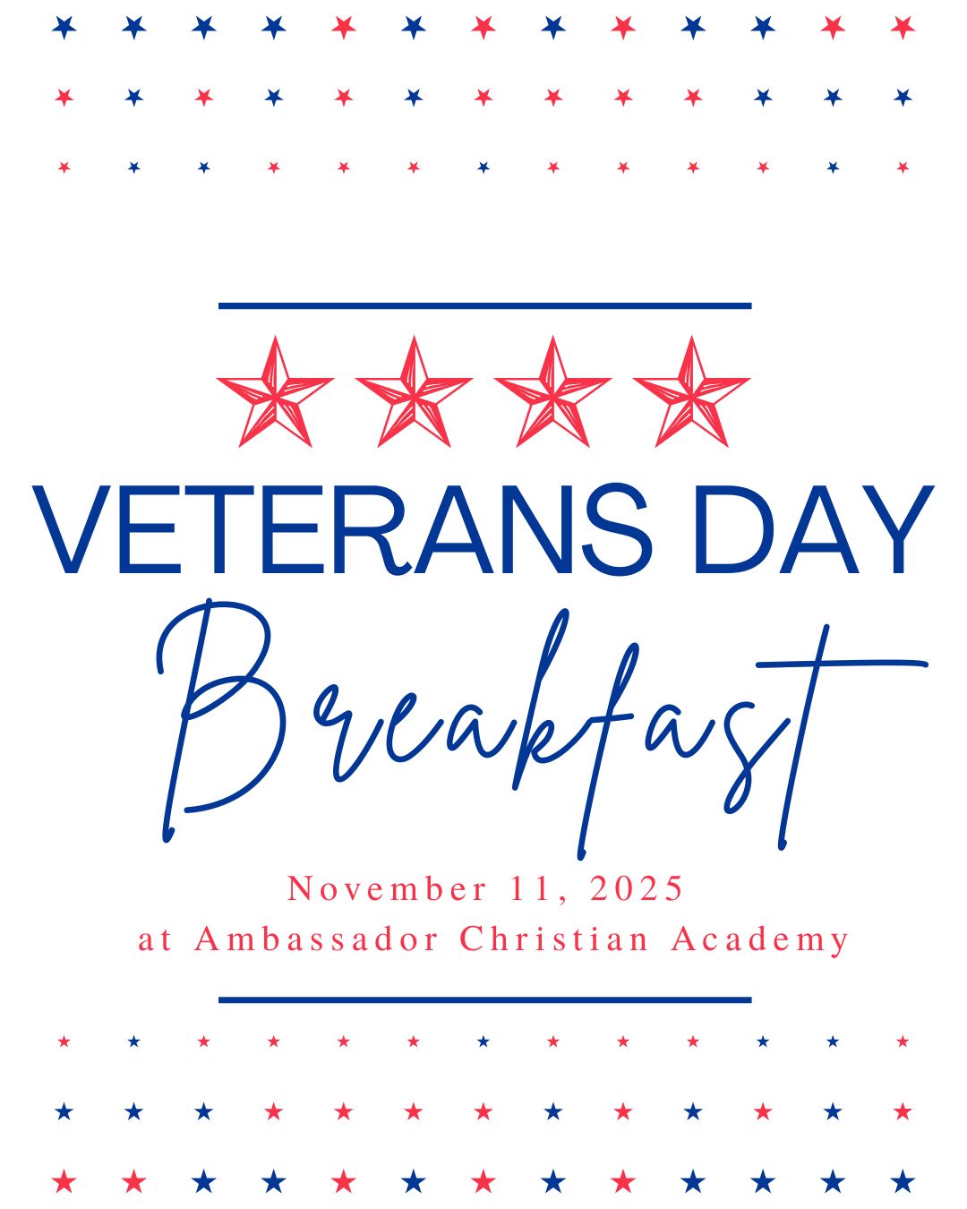 The Veterans Day Breakfast & Program will be held on Tuesday, November 11 at 9:30 AM. Active-duty personnel and veterans are invited to attend.